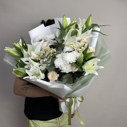 Букет из гортензии, роз, лилии, гербер, лимониума, сантини и эустомы в стильной упаковке Туманное поле