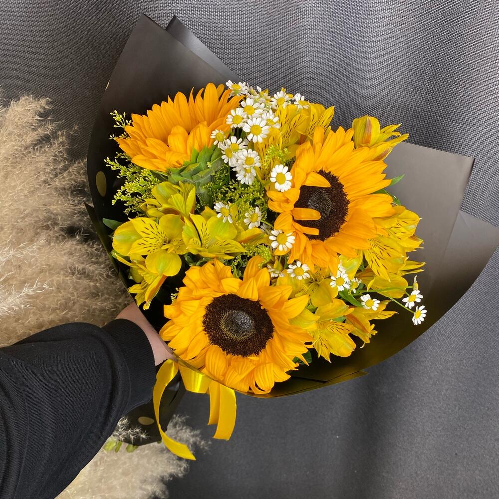 Подсолнух – 3 шт.Матрикария – 2 шт.Альстромерия – 4 шт.Солидаго – 2 шт.Дизайнерская упаковка – 1 шт.