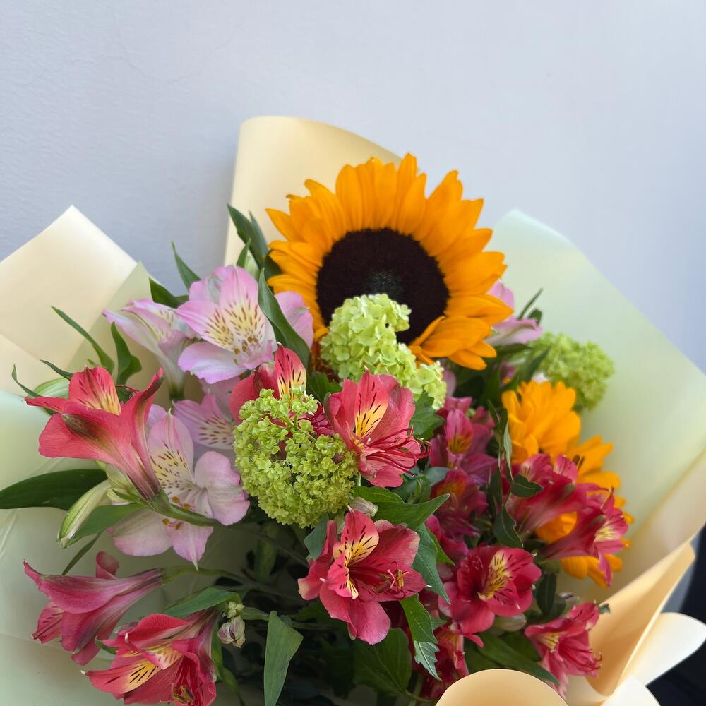 Подсолнух – 2 шт.Альстромерия – 6 шт.Вибурнум – 2 шт.Пленка дизайнерская – 1 шт.Лента атласная – 1 шт.