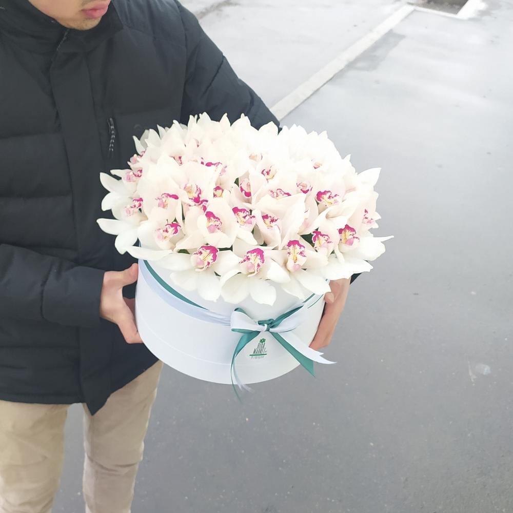 Лента атласная – 1 шт.Коробка шляпная – 1 шт.Оазис флористический – 3 шт.Цимбидиум белый – 45 шт.