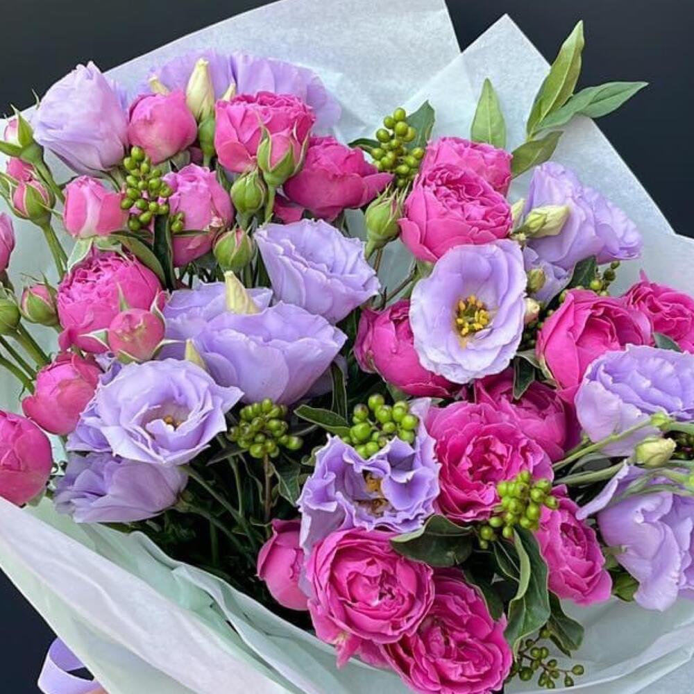 Гвоздики, Лизиантусы, Розы, Тюльпаны