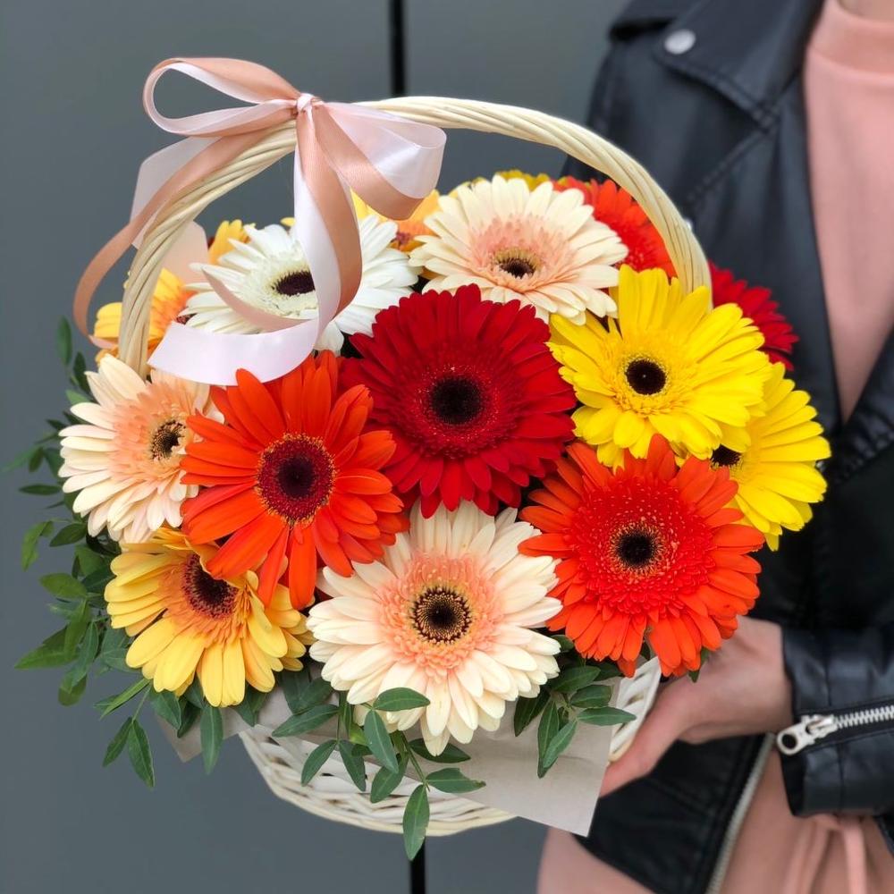 герберы – 17 шт. Писташ – 6 шт. Корзина – 1 шт. Оазис – 2 шт. Оформление – 1 шт.