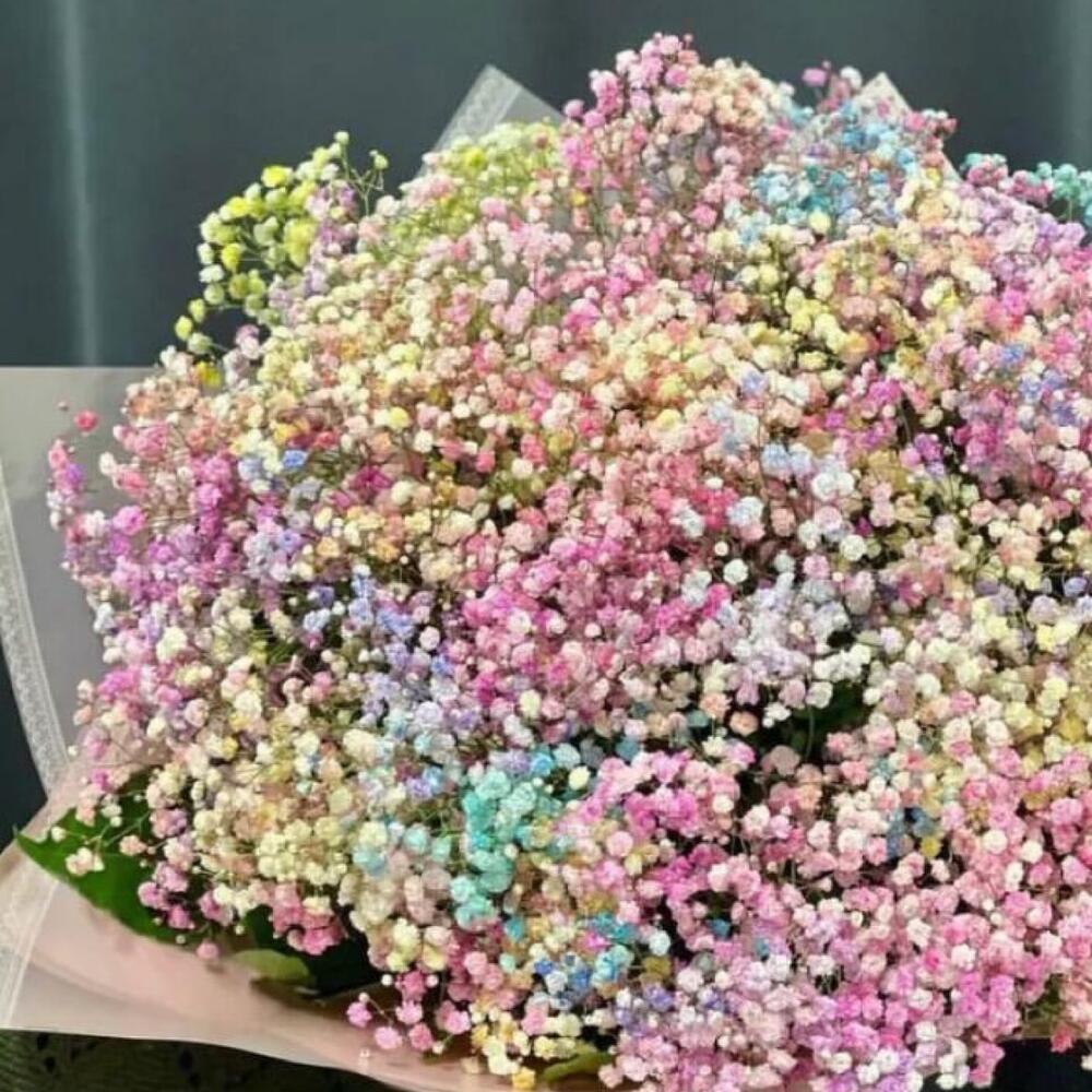 радужная гипсофила – 51 шт.Упаковка дизайнерская – 1 шт.Лента атласная – 2 шт.Открыточка с вашими пожеланиями – 1 шт.хорошее настроение – 100 шт.инструкция по уходу за цветами – 1 шт.коробка переноска – 1 шт.Кризал – 1 шт.