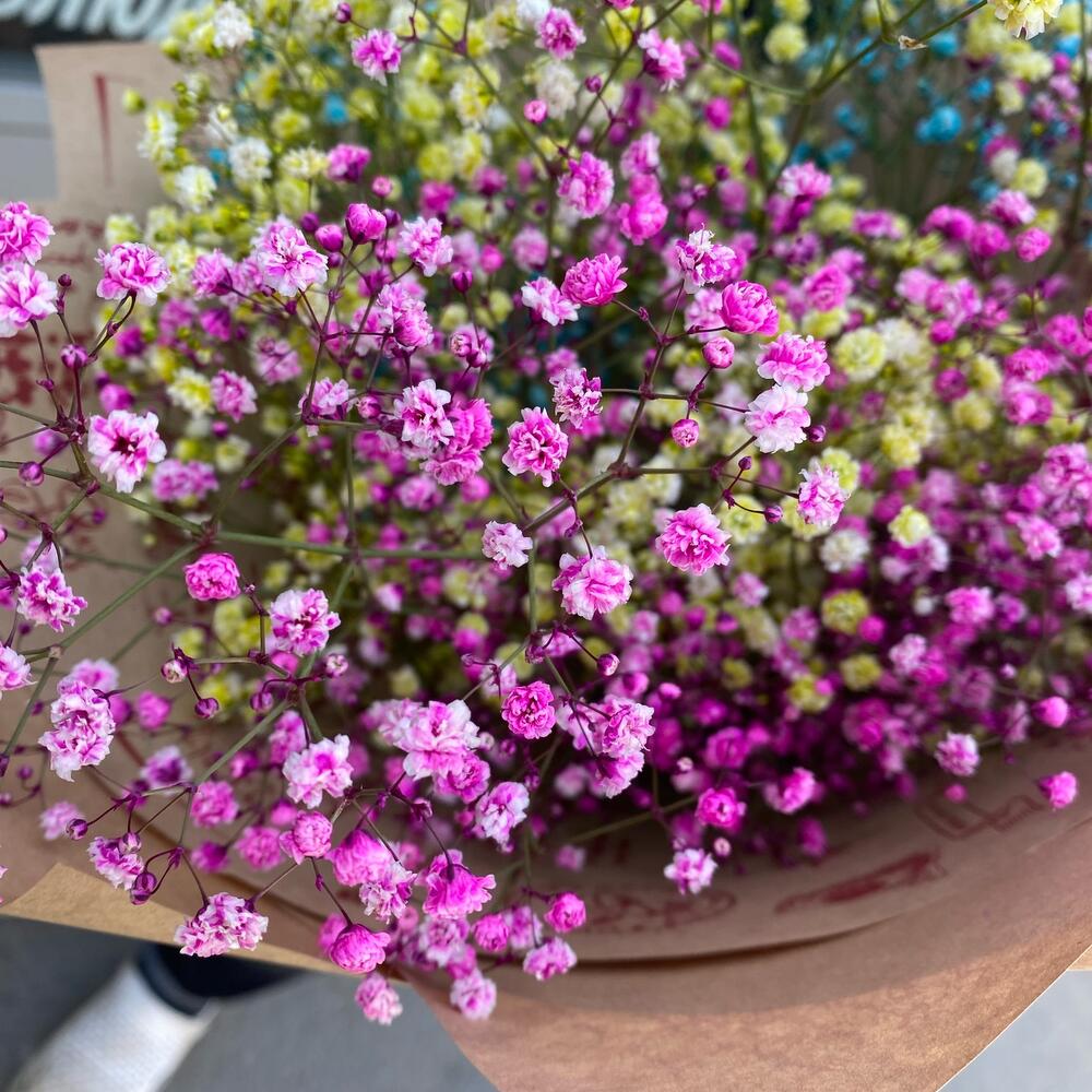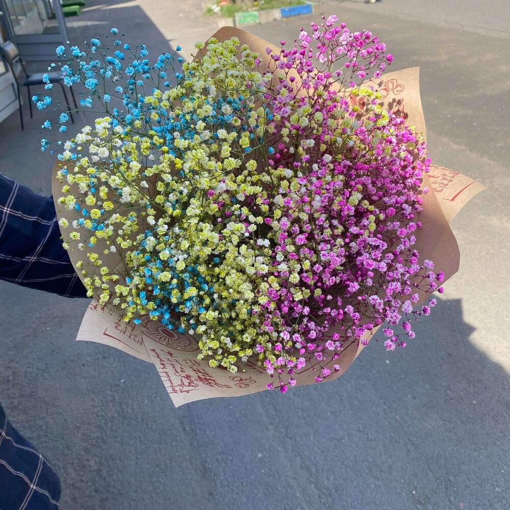 Лента атласная – 1 шт.Упаковка крафт – 1 шт.гипсофила радужная – 5 шт.