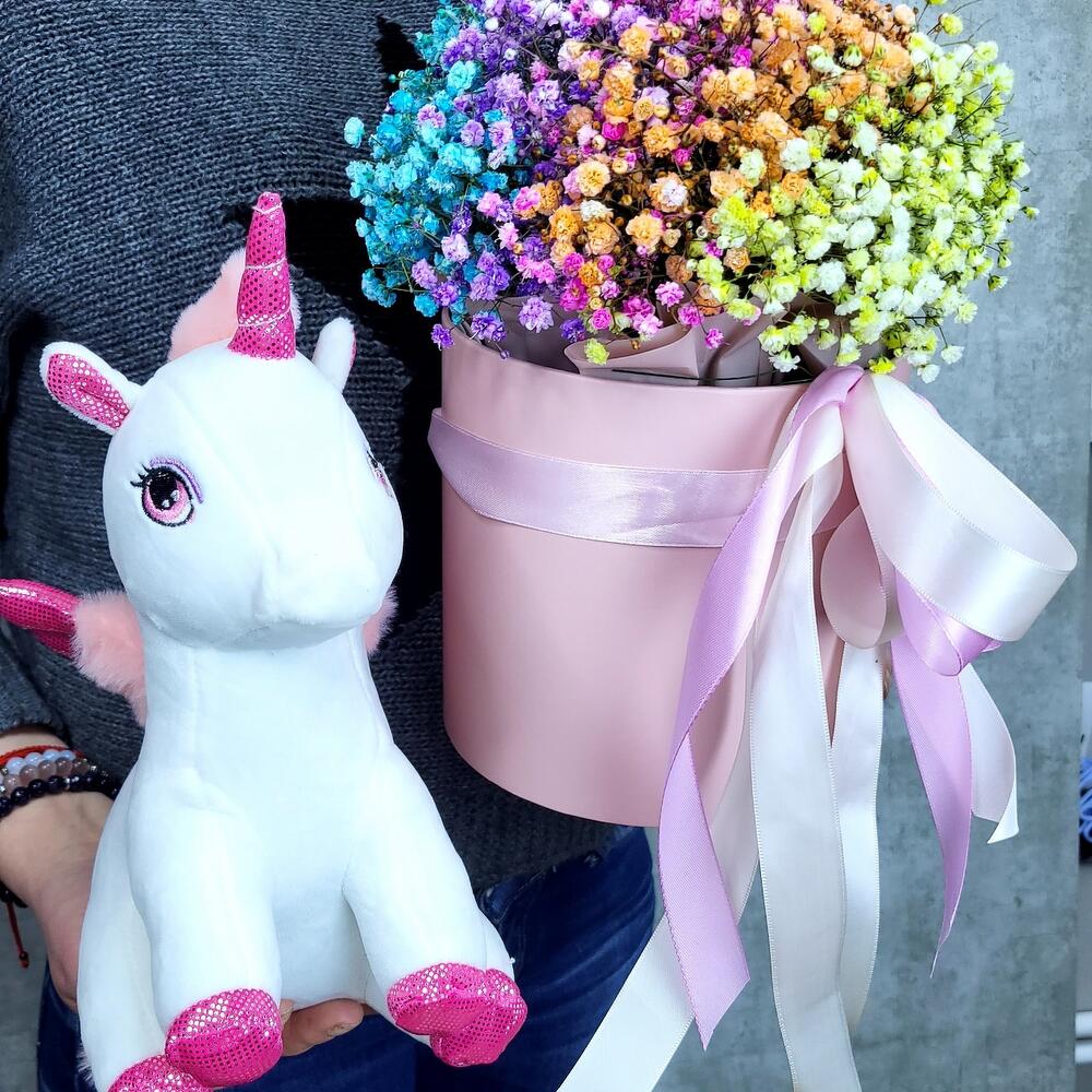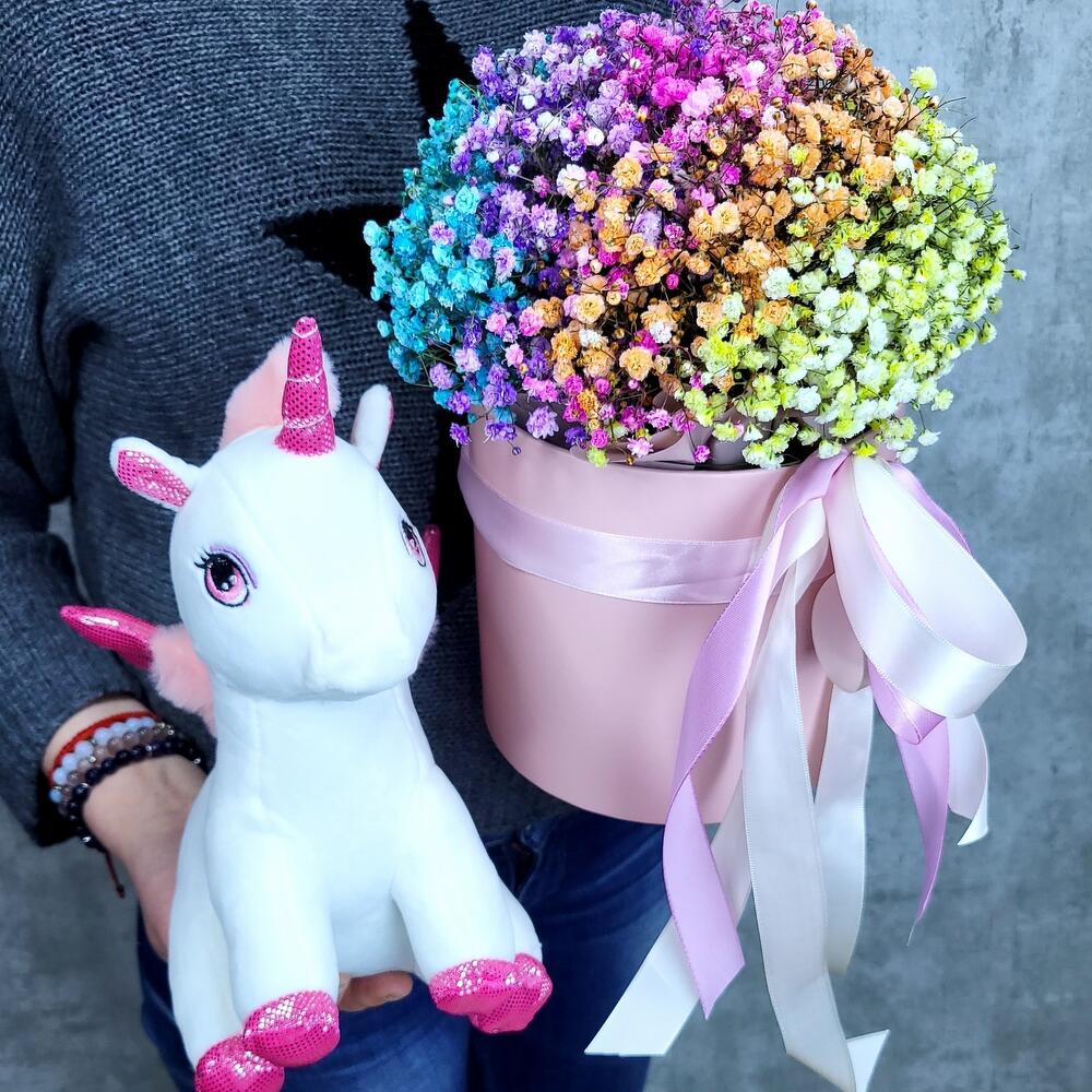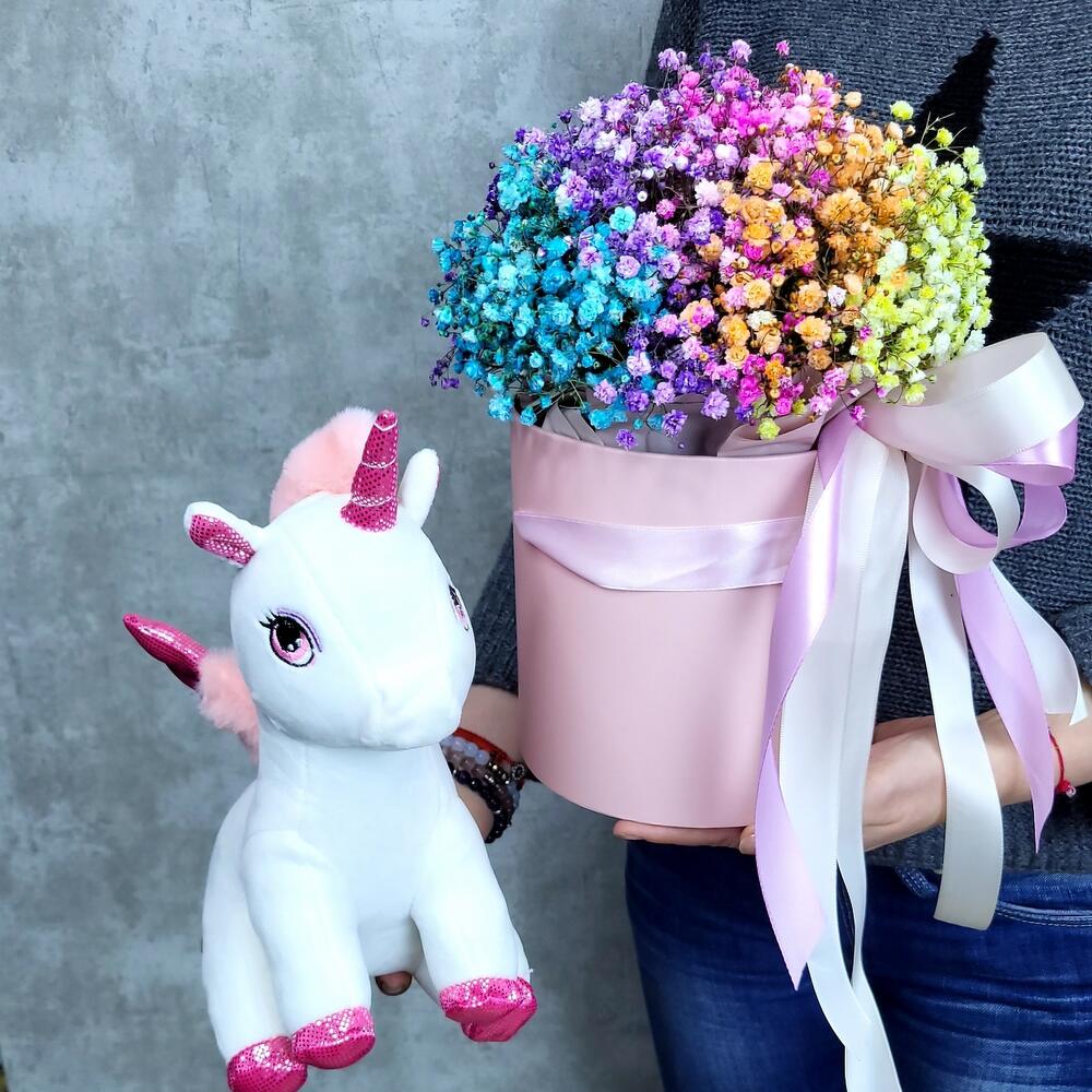 Единорог Евграф и коробочка с радужной гипсофилой