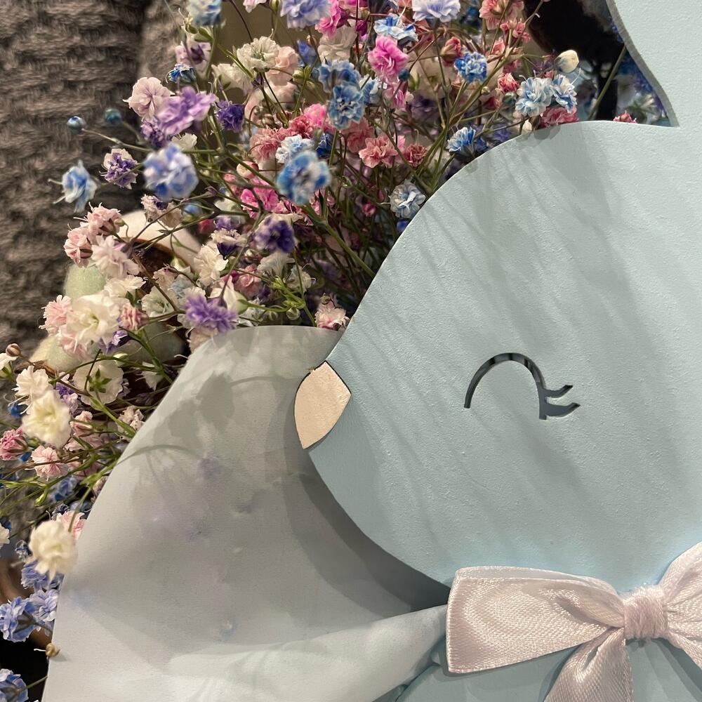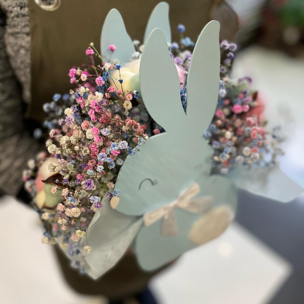 Гипсофила – 5 шт.Пленка матовая – 1 шт.Губка флористическая – 1 шт.хлопок цветной – 3 шт.ящик для цветов кролик – 1 шт.