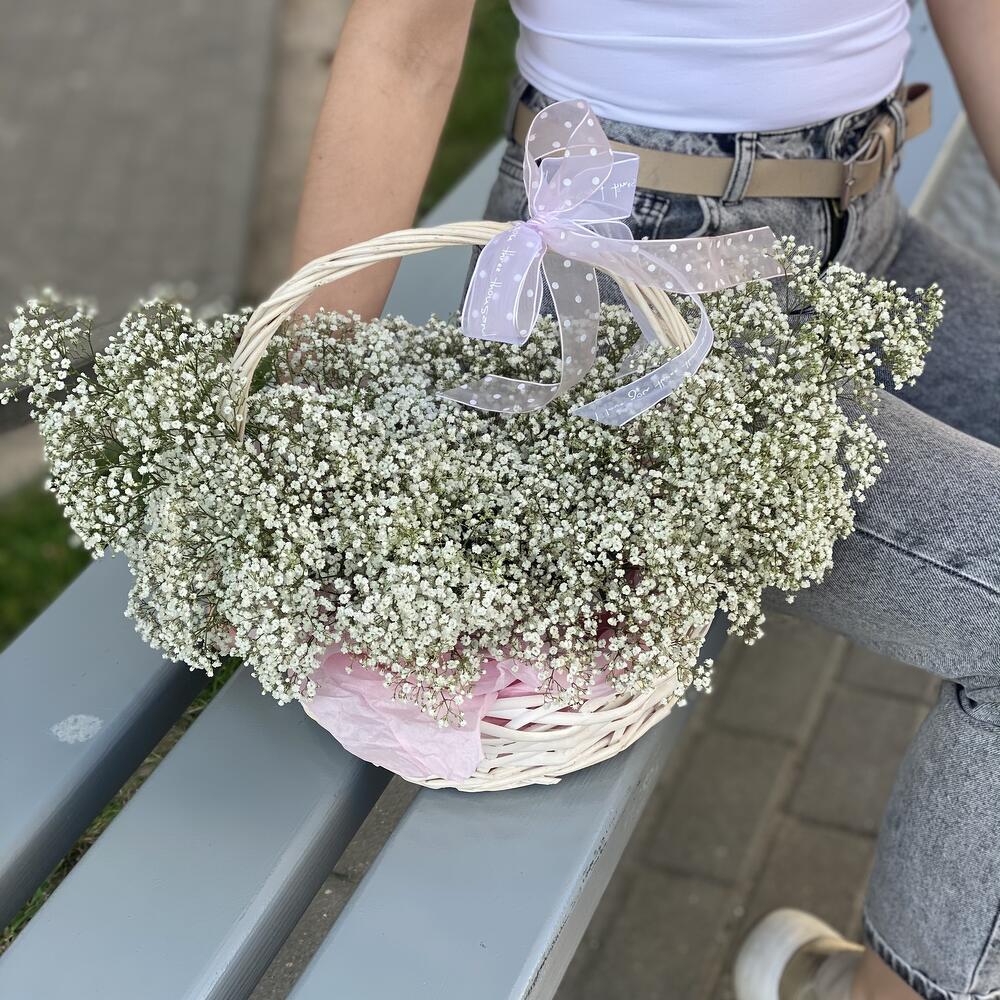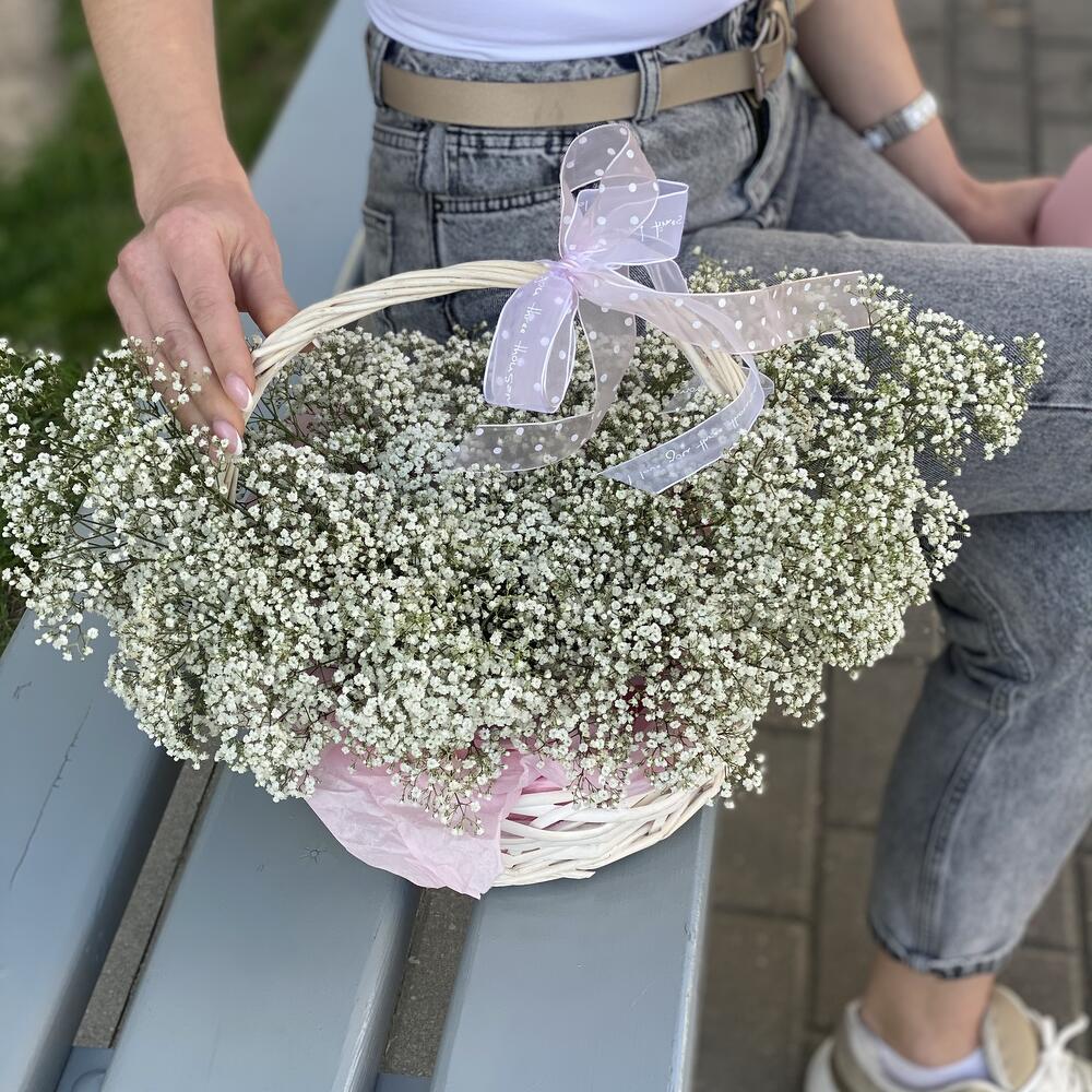 гипсофила белая – 10 шт. Корзина – 1 шт. Оазис – 2 шт. Оформление – 1 шт.