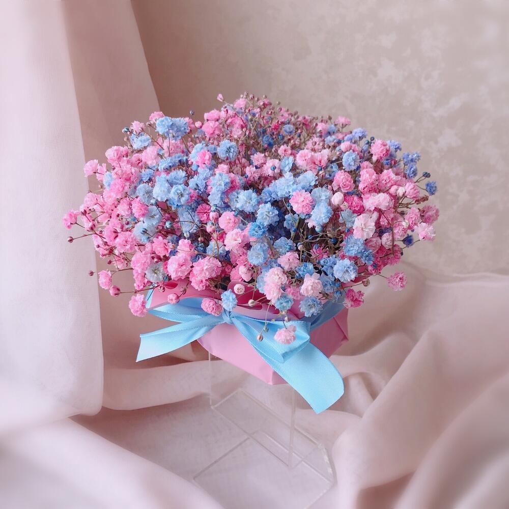 Лента атласная – 1 шт.Флористическая губка (оазис) – 1 шт.Гипсофила розовая – 2 шт.Гипсофила голубая – 1 шт.