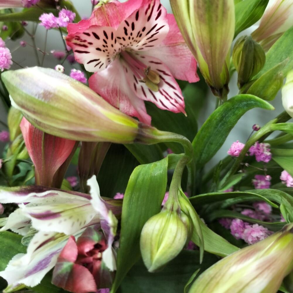 Лента атласная – 1 шт.Упаковка дизайнерская – 2 шт.Гипсофила розовая – 1 шт.альстромерия микс европа 70 см – 15 шт.