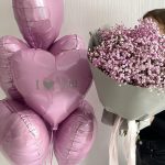 В набор входит:Букет из 13 веток розовой гипсофилы;Фонтан из фольгированных сердец с надписью