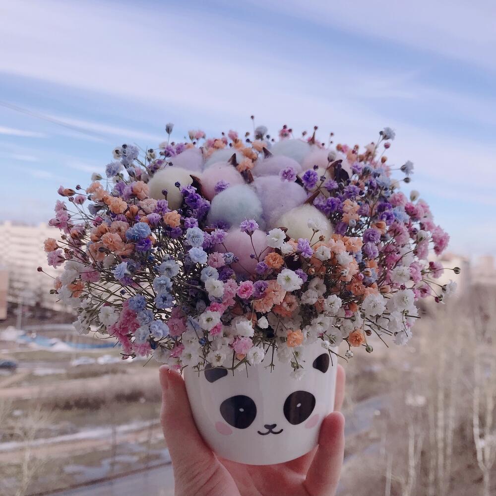 Радужная гипсофила с хлопком в керамическом кашпо «Панда»