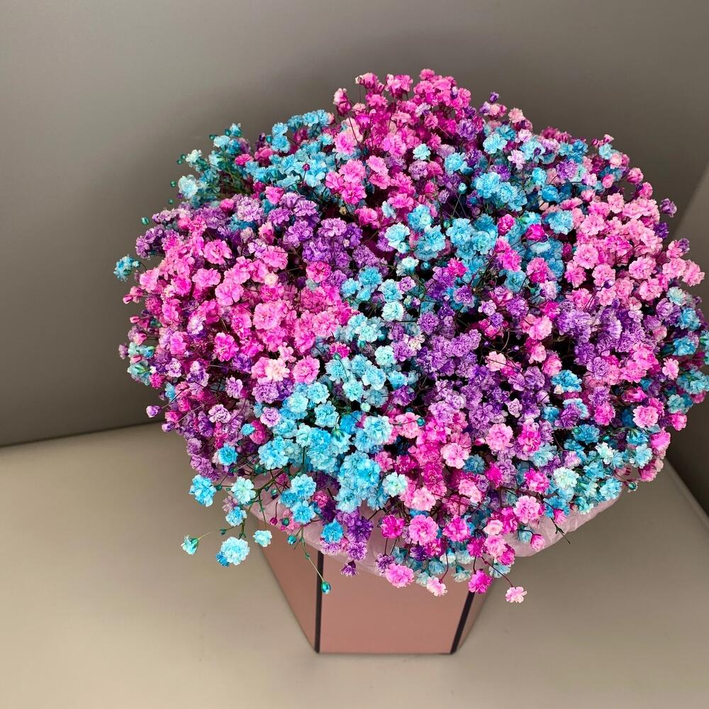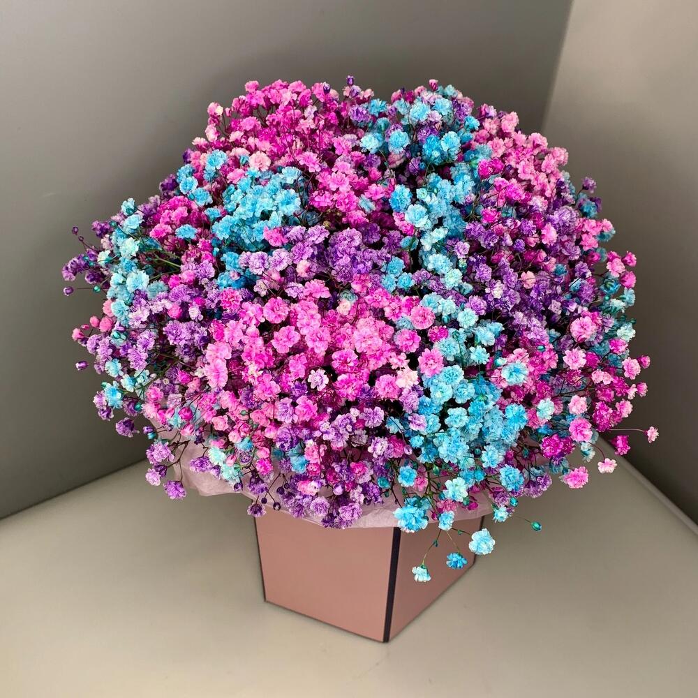 гипсофила радужная – 8 шт.Коробка шляпная – 1 шт.Тишью – 2 шт.Оазис флористический – 1 шт.Пленка прозрачная – 1 шт.Лента атласная – 2 шт.