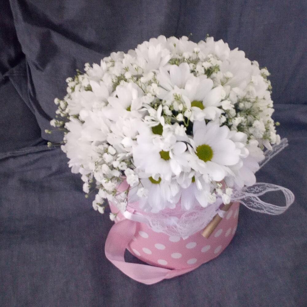 Ромашки с гипсофилой в шляпной коробке
