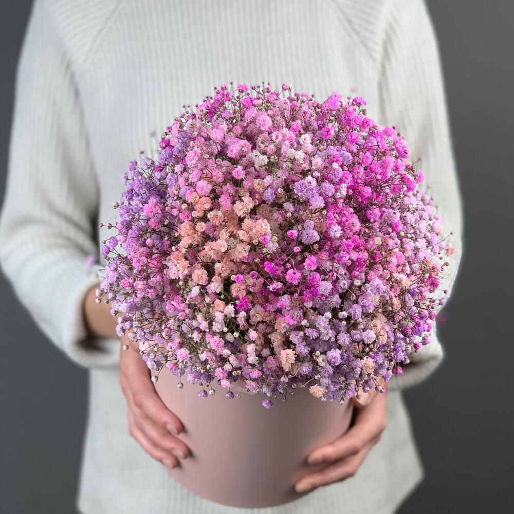 “Сиреневый туман” – композиция из гипсофилы в шляпной коробке