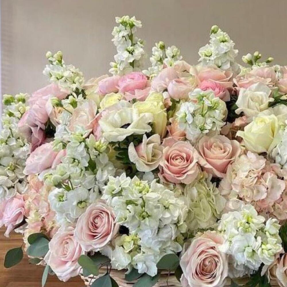 розы одноголовые – 40 шт.Маттиола – 45 шт.Гортензия – 10 шт.Корзина плетеная – 1 шт.Открыточка с вашими пожеланиями – 1 шт.хорошое настроение – 100 шт.инструкция по уходу за цветами – 1 шт.Оазис флористический – 1 шт.Кризал – 1 шт.