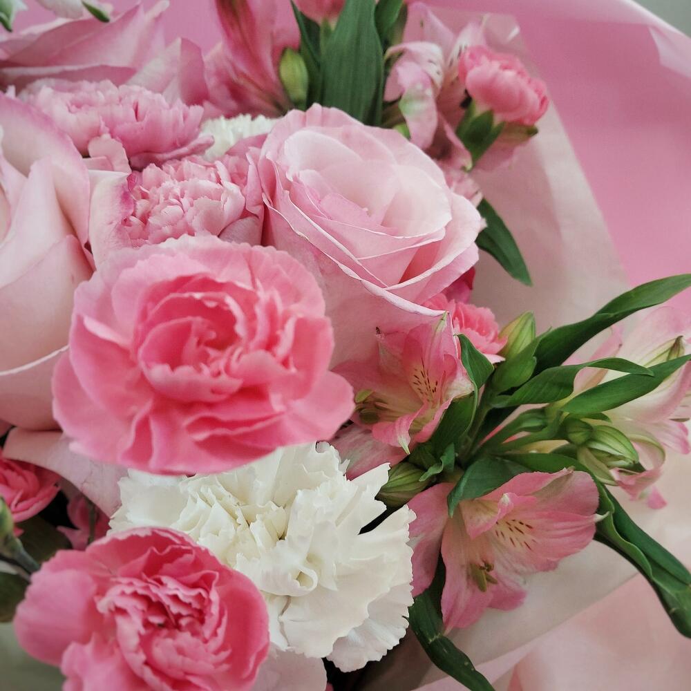 Роза – 3 шт.Гвоздика кустовая – 4 шт.Гвоздика – 6 шт.Альстромерия – 3 шт.Тишью – 2 шт.Авторская упаковка – 1 шт.Лента атласная – 1 шт.