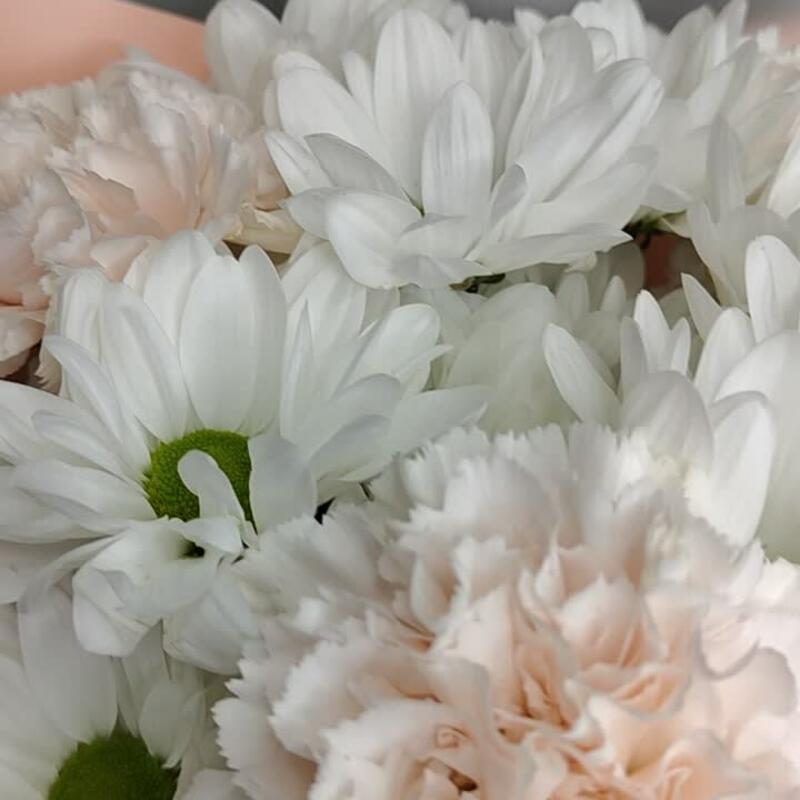 Лента атласная – 1 шт.Диантус – 4 шт.Хризантема кустовая ромашковая белая – 3 шт.упаковка флористическая – 1 шт.