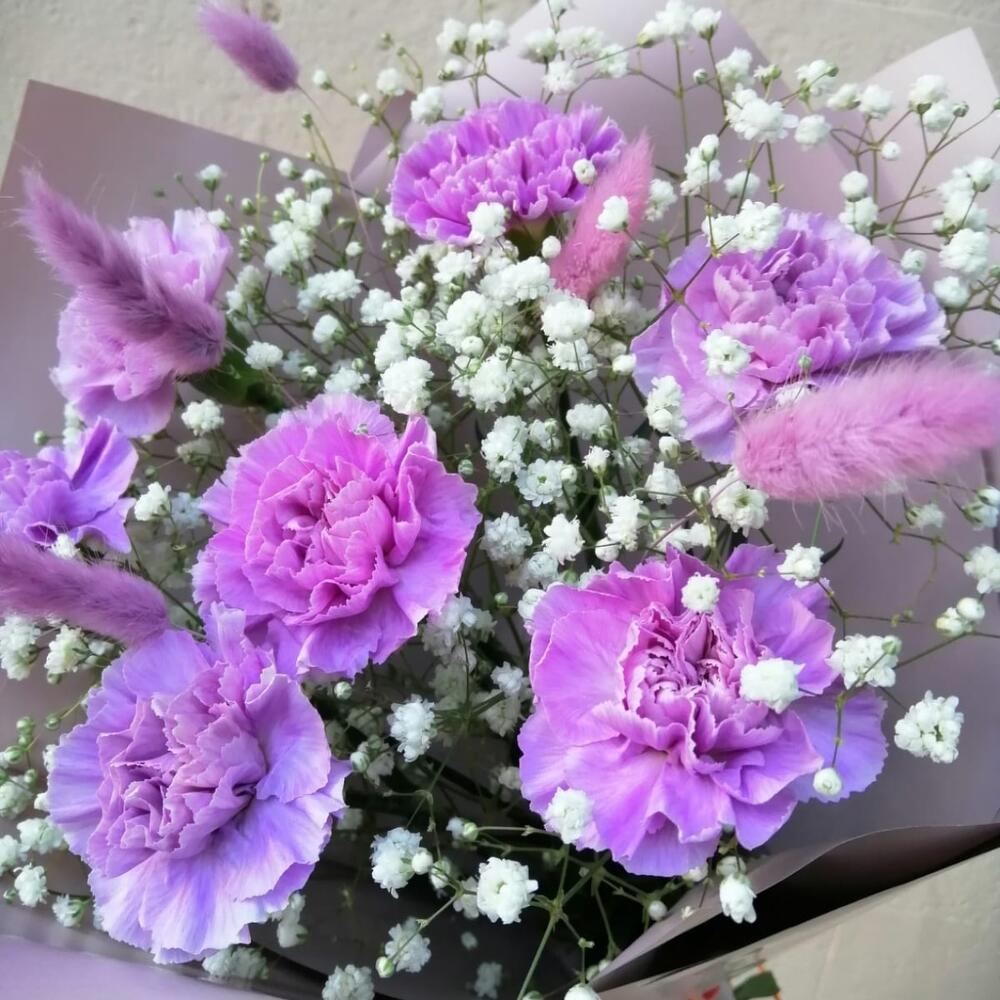 Гвоздика лунная – 7 шт.Гипсофила – 2 шт.Лагурус – 5 шт.Упаковка – 1 шт.Лента – 1 шт.