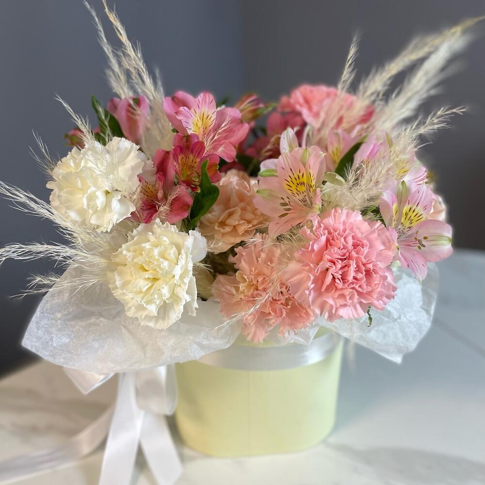 Цветочная композиция из альстромерий и гвоздик в коробке