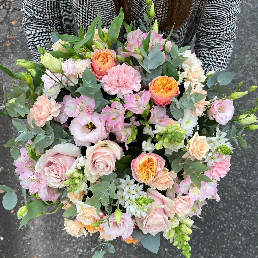 Гвоздики, Кустовые розы, Лизиантусы, Пионовидные розы, Розы