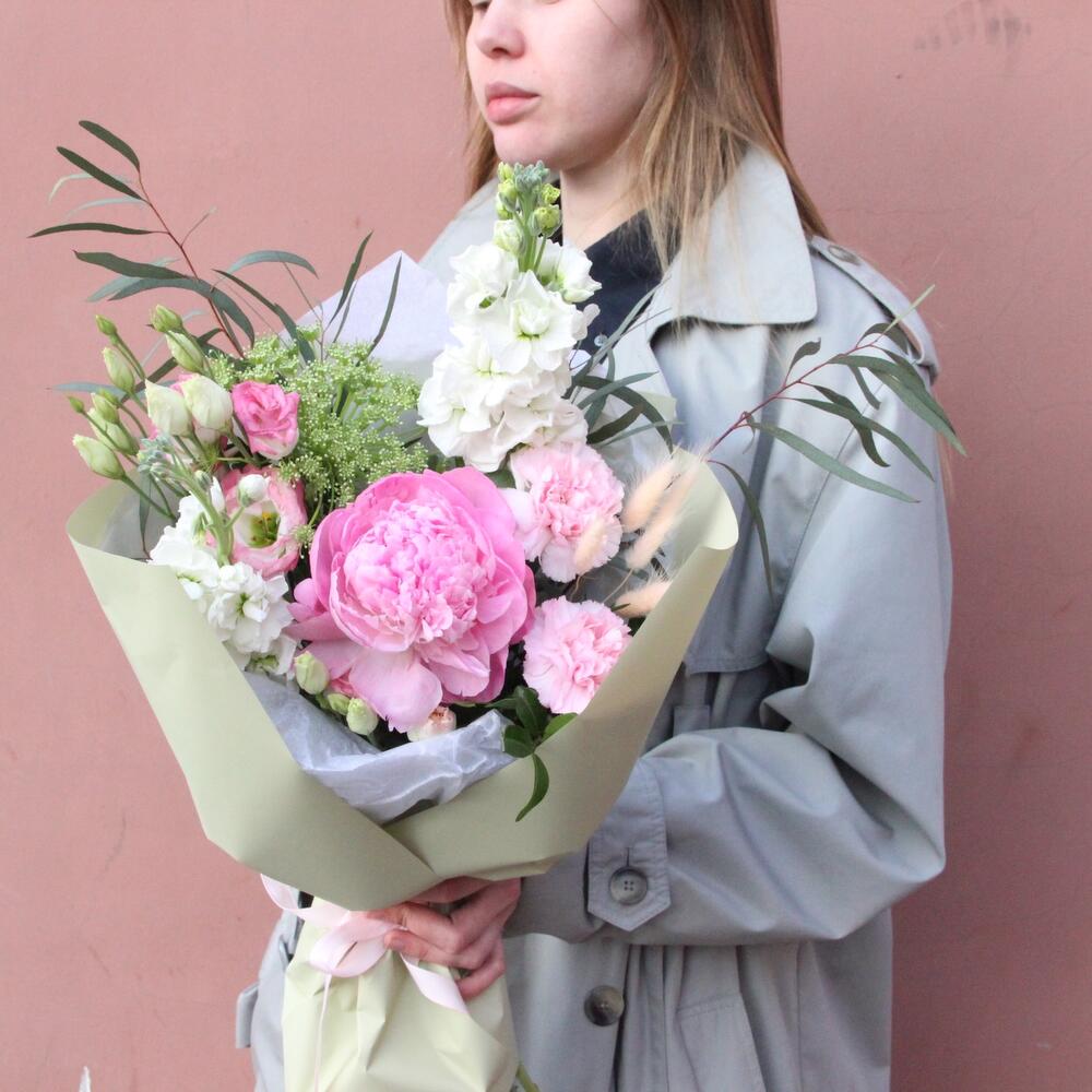 Пион – 1 шт.Лизиантус – 1 шт.Маттиола – 2 шт.Амми – 1 шт.Гвоздика – 1 шт.Лагурус – 5 шт.Эвкалипт – 2 шт.Упаковка дизайнерская – 1 шт.Лента атласная – 1 шт.