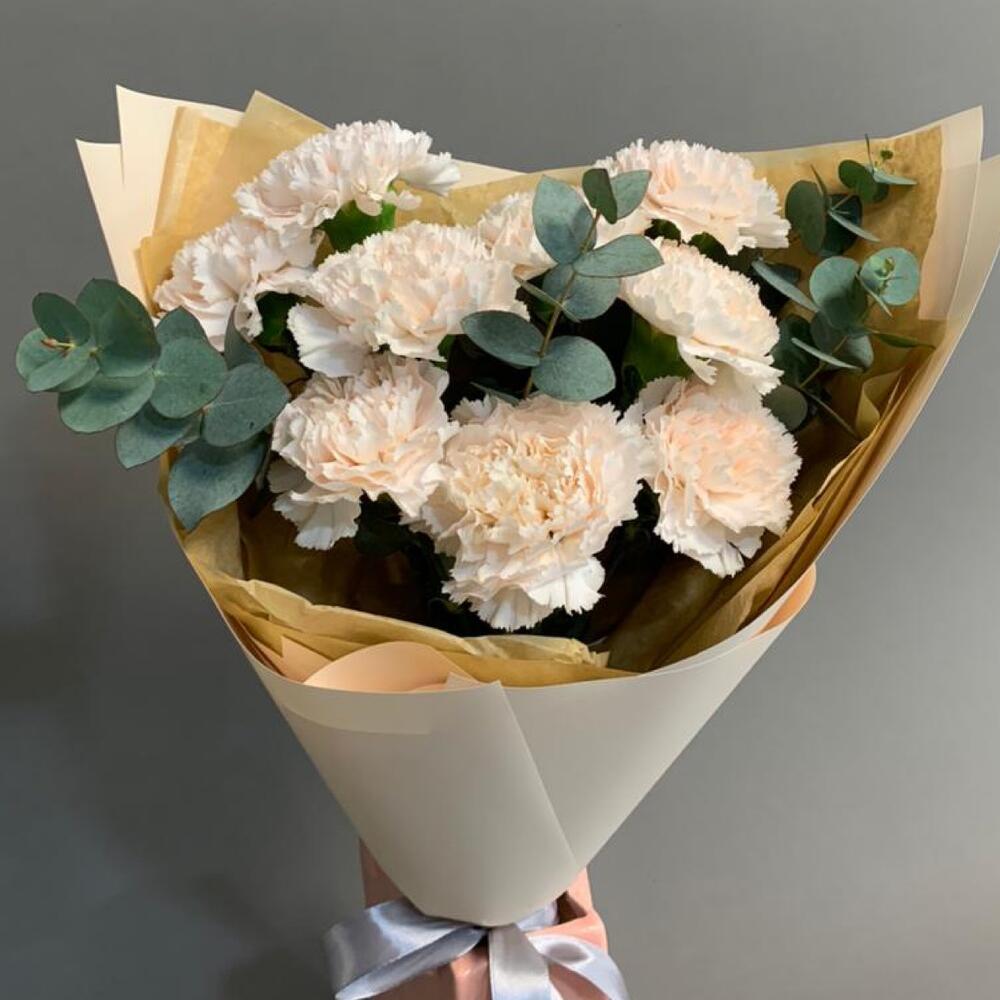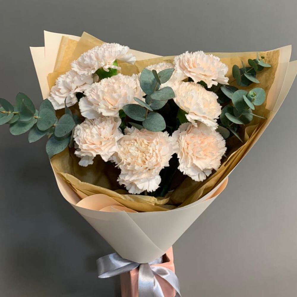 Эвкалипт – 3 шт.Лента атласная – 1 шт.Тишью – 2 шт.Пленка матовая – 3 шт.диантус брют кремовый – 9 шт.