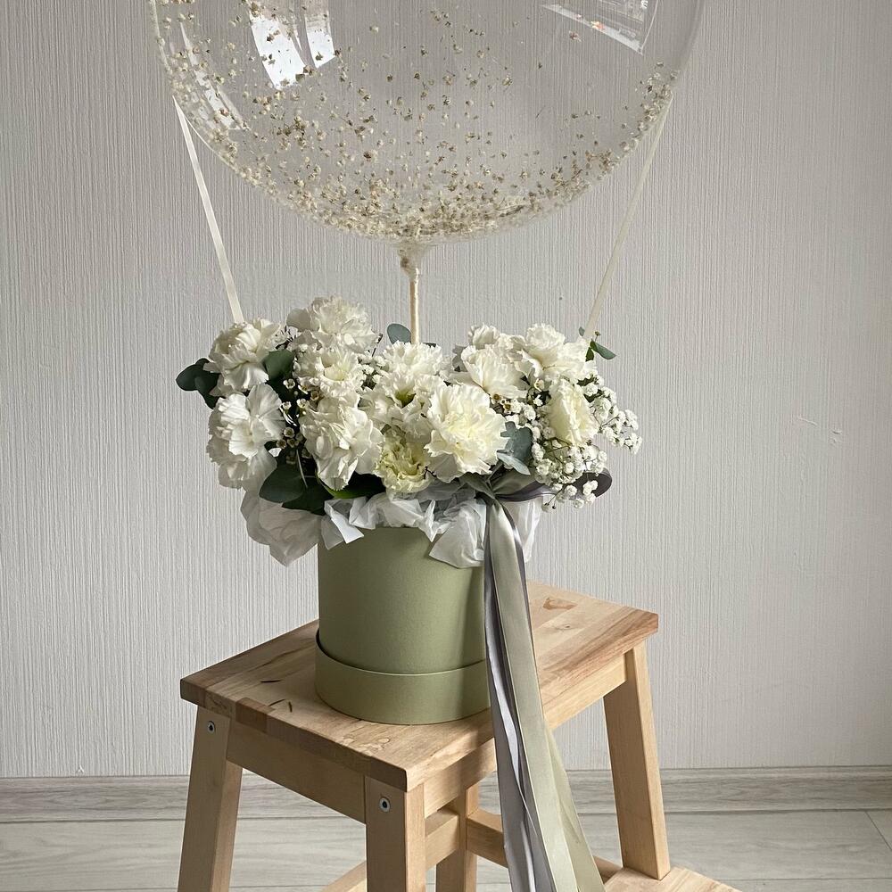 Гипсофила – 1 шт.Эустома – 1 шт.Хамелациум белый – 1 шт.диантусы – 9 шт.