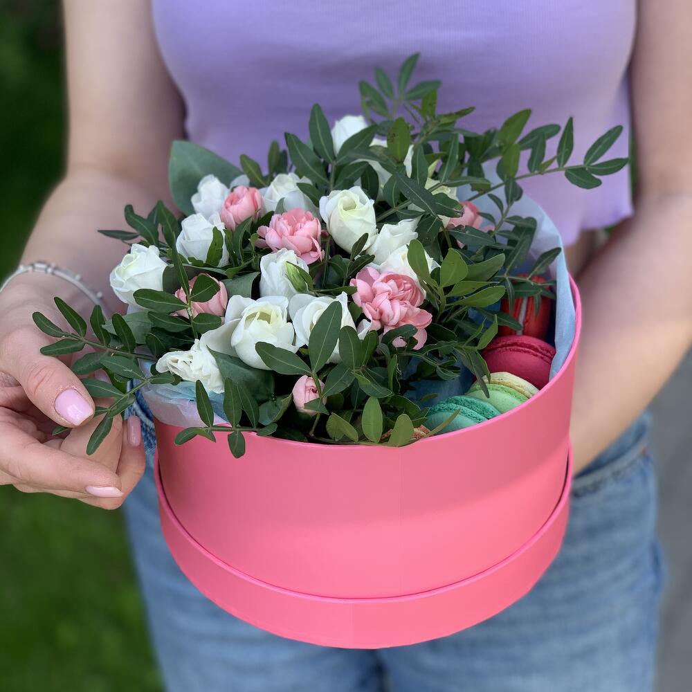 Коробочка из эустомы, кустовой гвоздички, зелени, с добавлением любимых макарун.