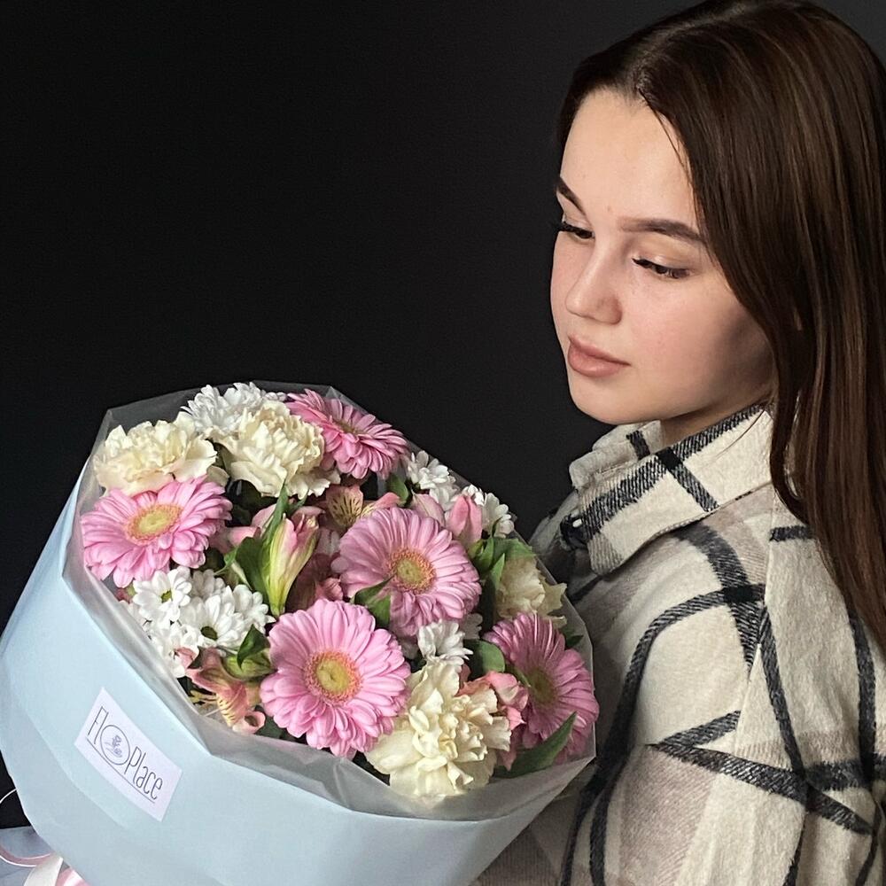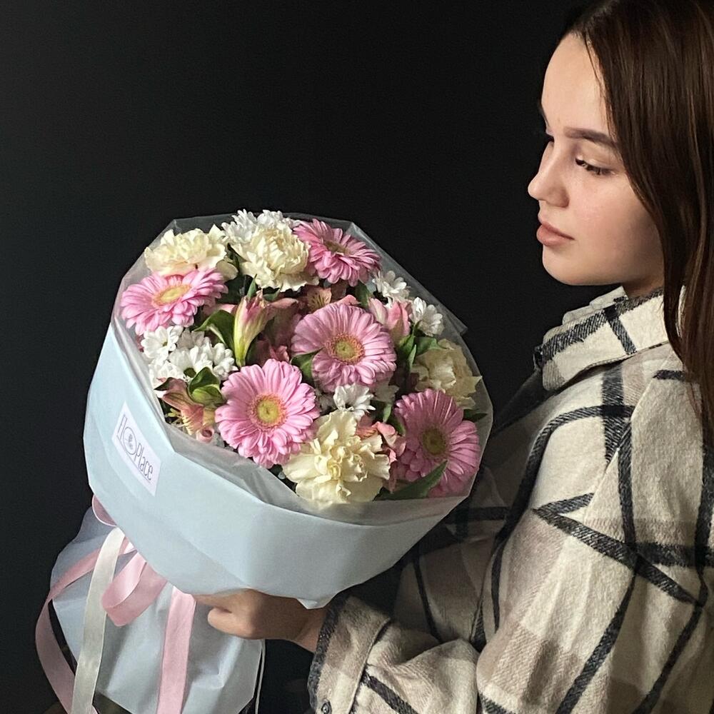 Гербера мини – 5 шт.Диантус – 4 шт.Хризантема мини – 4 шт.Альстромерия – 3 шт.Авторская упаковка – 1 шт.памятка по уходу и подкормка для цветов – 1 шт.крафт конверт – 1 шт.