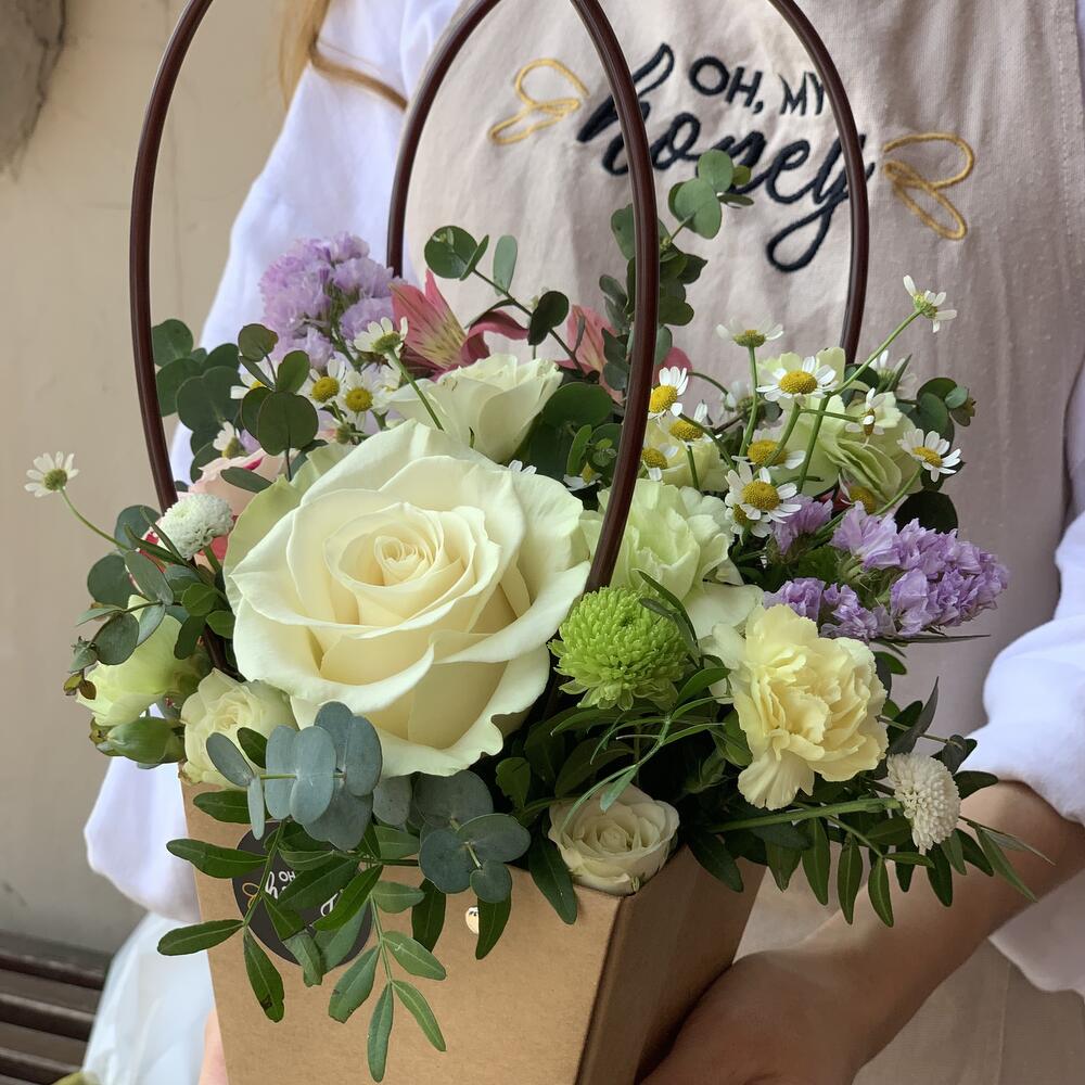 Роза – 1 шт.Роза кустовая – 1 шт.Гвоздика кустовая – 2 шт.Матрикария – 1 шт.Статица – 1 шт.Фисташка – 1 шт.Эвкалипт – 1 шт.Сумочка – 1 шт.Альстромерия – 1 шт.