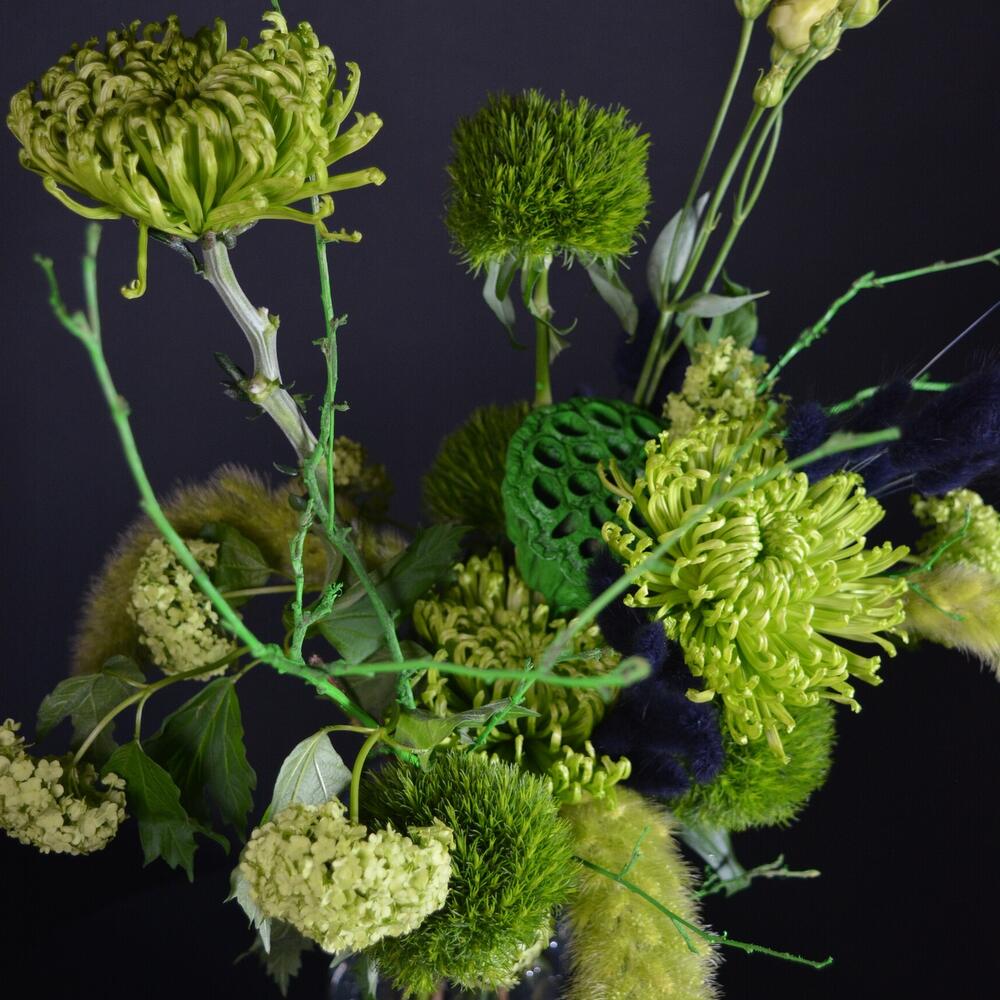 Хризантема – 4 шт.Гвоздика – 4 шт.Вибурнум – 2 шт.Сетария – 3 шт.ветки декоративные – 2 шт.Лагурус – 7 шт.Лотос – 1 шт.