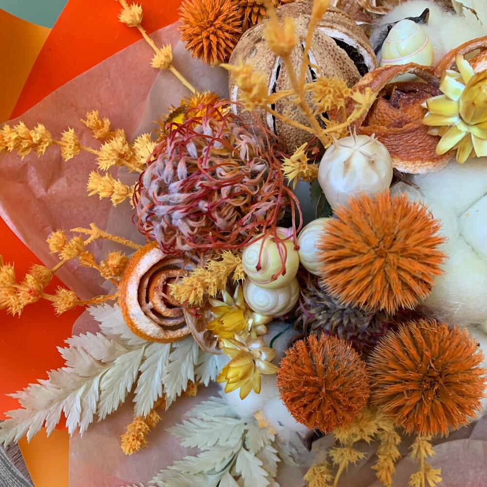 Хлопок (сухоцвет) – 5 шт.Апельсин – 1 шт.апельсиновые дольки – 5 шт.эхинопсис – 5 шт.Нигелла сухоцвет – 3 шт.ракушки лимонные – 5 шт.Гелихризум – 6 шт.папоротник стабилизированный – 1 шт.шандра стабилизированная – 3 шт.нутан сухоцвет – 2 шт.гортензия сухоцвет – 1 шт.Тишью – 1 шт.Пленка матовая – 1 шт.