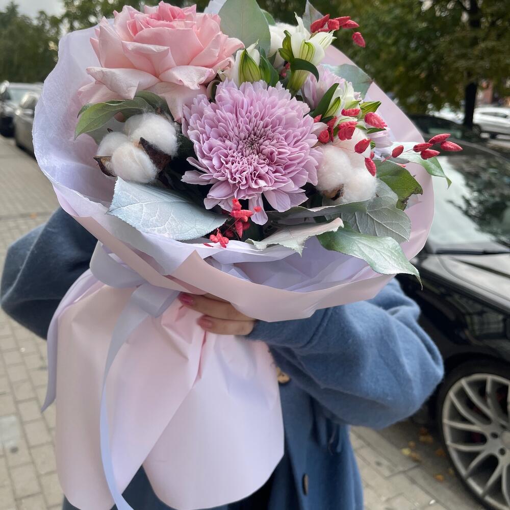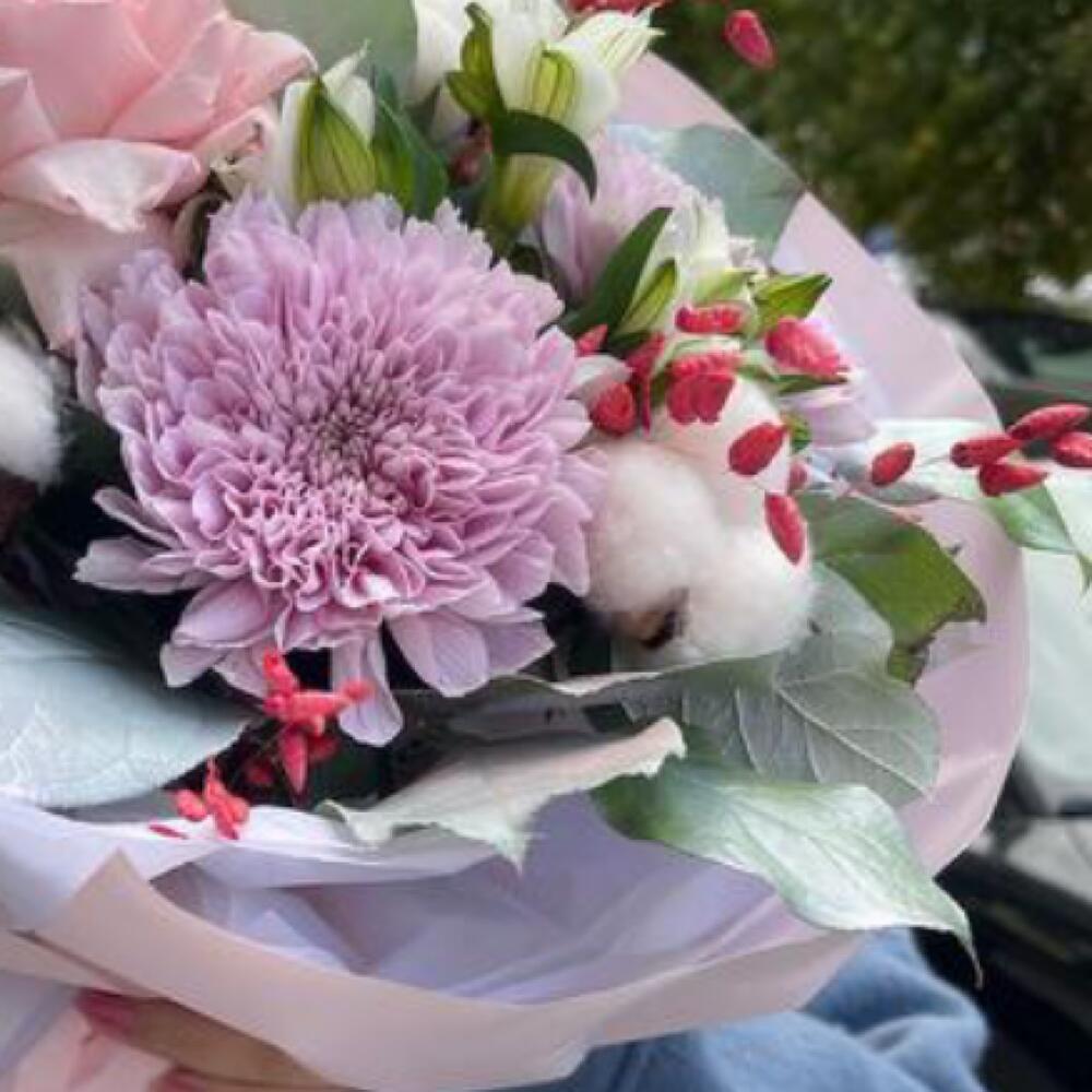 Альстромерия – 1 шт.Папоротник – 1 шт.Хлопок – 3 шт.Хризантема – 2 шт.Лента атласная – 2 шт.Пленка – 2 шт.Сухоцветы – 3 шт.Салал пучок – 1 шт.Охара – 1 шт.тишь – 2 шт.