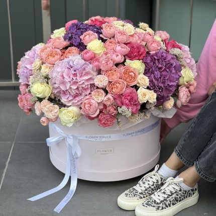 Коробка Богема из кустовых и одноголовых роз, гортензий и озотамнуса