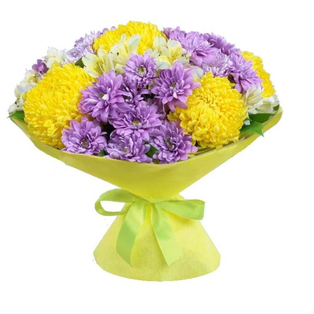 Листья салал – 1 шт.лента декоративная – 1 шт.Фетр – 1 шт.Альстромерия белая – 4 шт.Хризантема кустовая розовая – 5 шт.Хризантема одноголовая желтая – 5 шт.