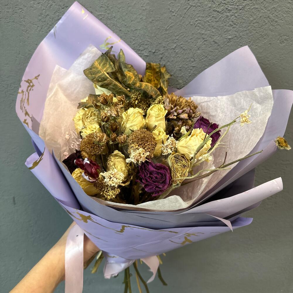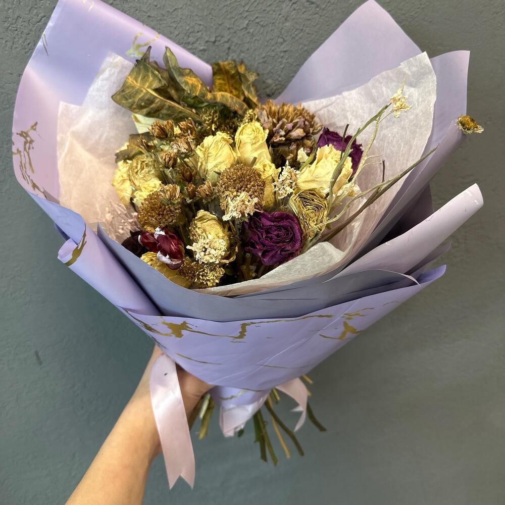 «Лавандовое созвездие» Букет из розы, гвоздики, статица и хлопка