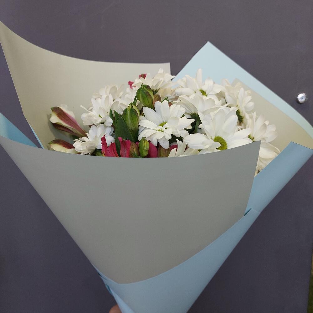 Хризантема кустовая – 4 шт.Альстромерия – 5 шт.Упаковка дизайнерская – 3 шт.Лента атласная – 2 шт.