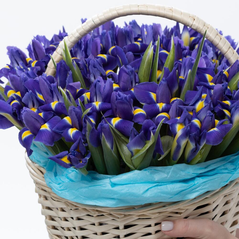 Ирис – 51 шт.Корзина плетеная – 1 шт.Лента атласная – 1 шт.Открыточка с вашими пожеланиями – 1 шт.хорошее настроение – 100 шт.инструкция по уходу за цветами – 1 шт.Кризал – 1 шт.