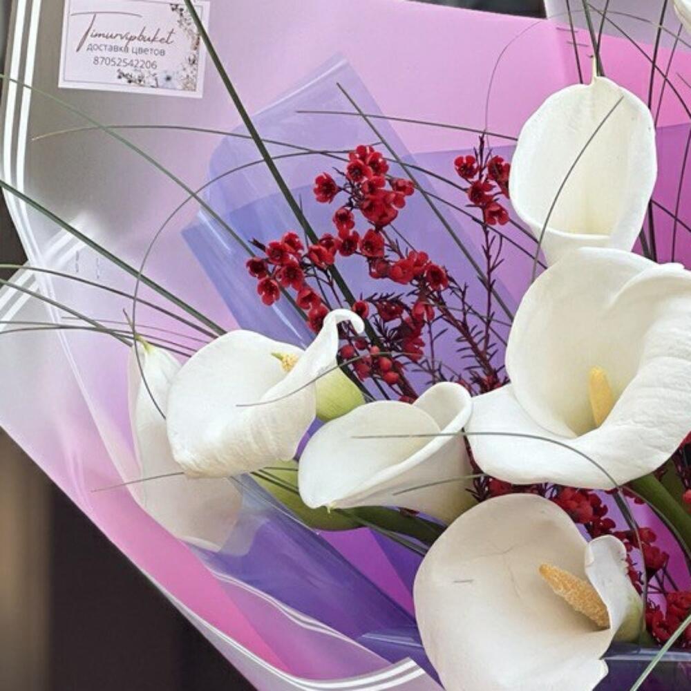 Калла – 11 шт. Хамелациум – 3 шт. Берграсс – 1 шт. Упаковка дизайнерская – 8 шт. Лента – 1 шт.