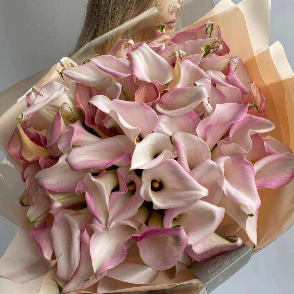 Калла розовая – 51 шт.Упаковка дизайнерская – 2 шт.Лента атласная – 2 шт.Открыточка с вашими пожеланиями – 1 шт.хорошее настроение – 100 шт.инструкция по уходу за цветами – 1 шт.коробка переноска – 1 шт.Кризал – 1 шт.