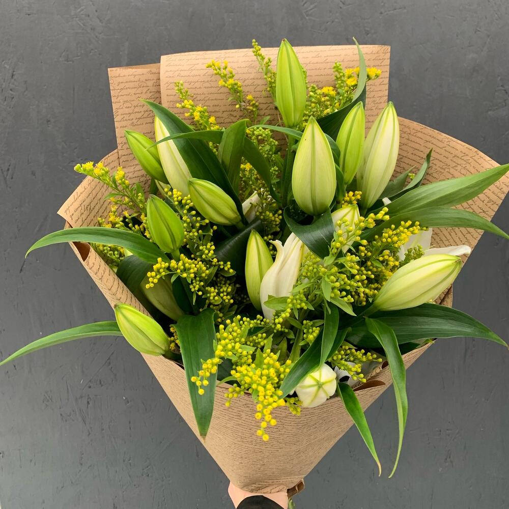 Лилия – 5 шт.Солидаго – 3 шт.Упаковка дизайнерская – 2 шт.Лента атласная – 2 шт.