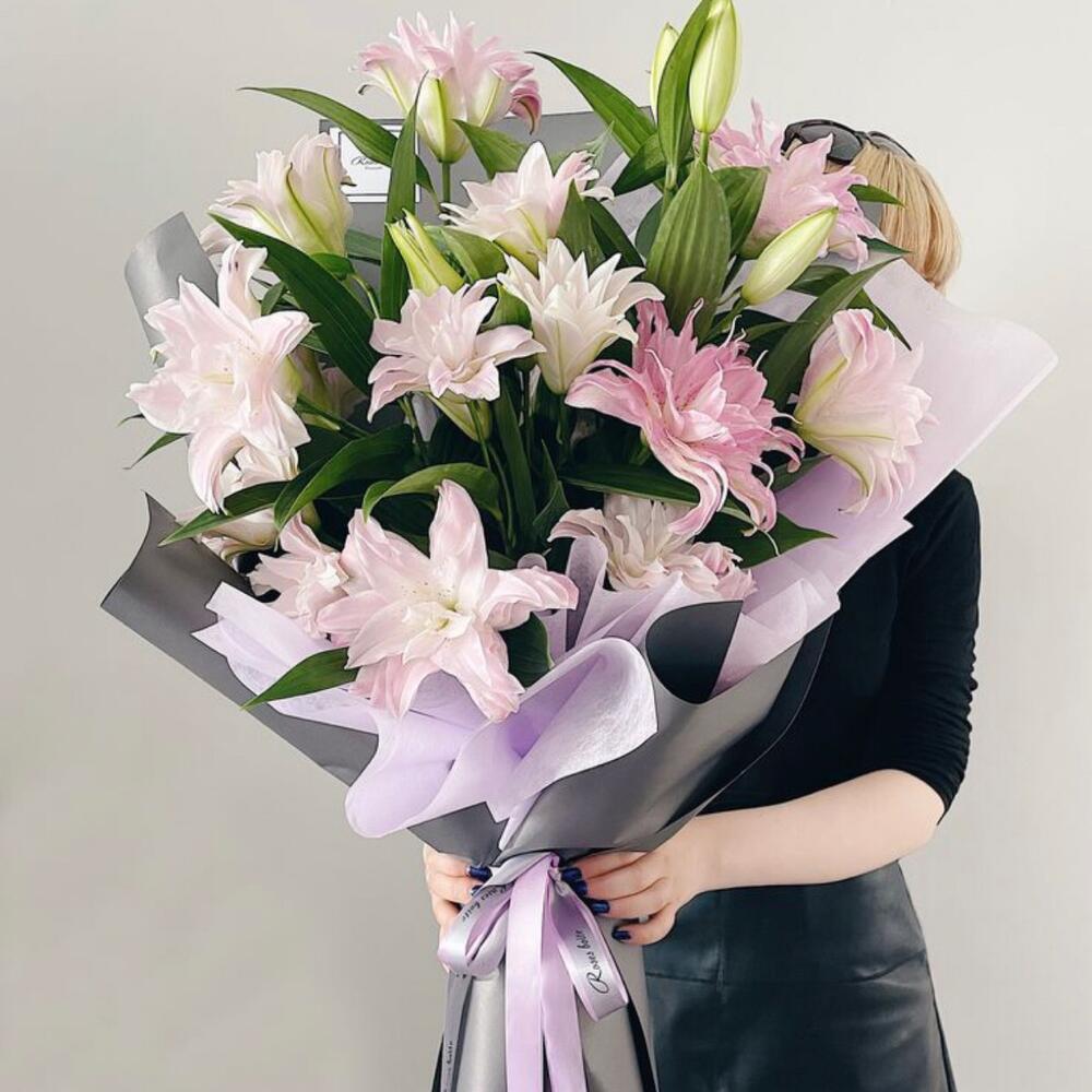 Лента атласная – 2 шт.Упаковка дизайнерская – 3 шт.лилия махровая премиум – 7 шт.