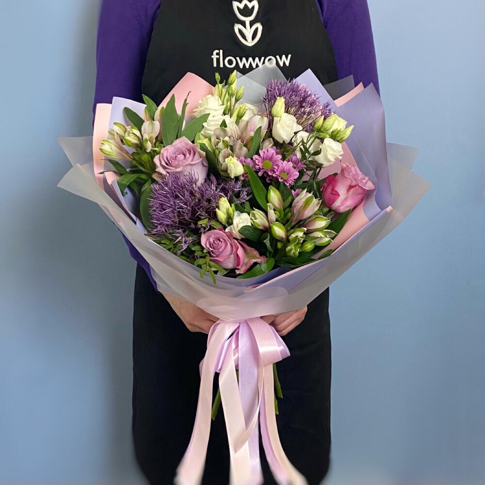 Букет с сиреневыми розами и аллиумом