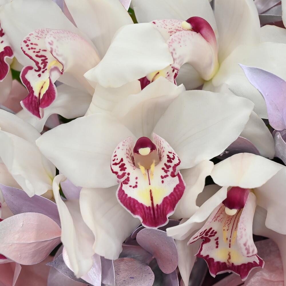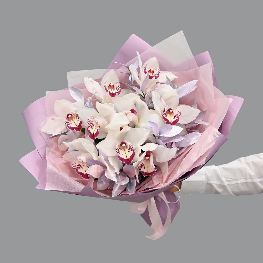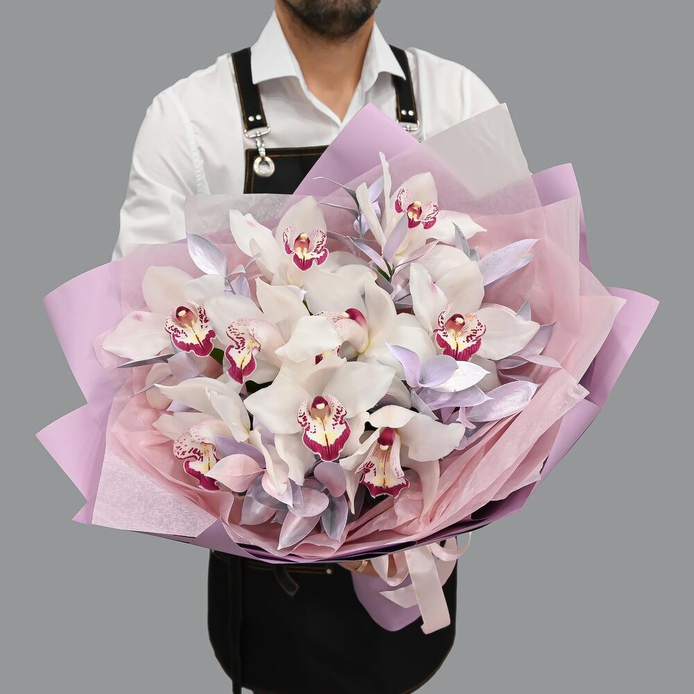 Орхидея Цимбидиум – 9 шт.Рускус – 10 шт.Упаковка дизайнерская – 1 шт.