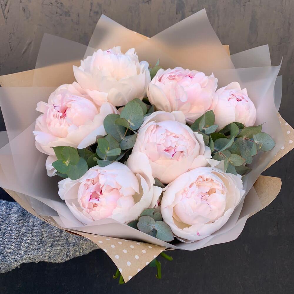 Пион – 7 шт.Эвкалипт – 10 шт.Упаковка дизайнерская – 2 шт.Лента атласная – 1 шт.
