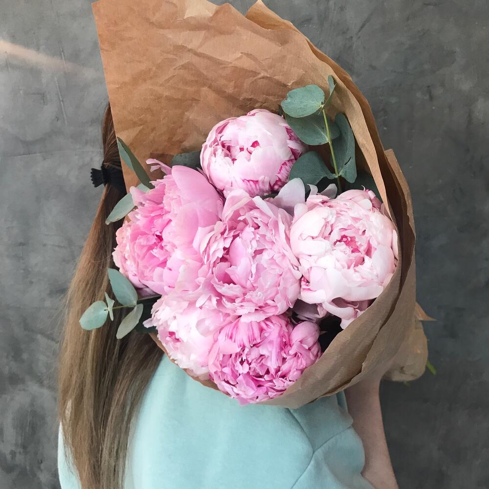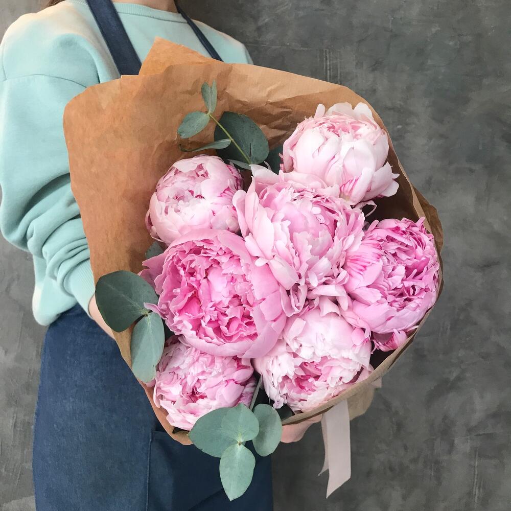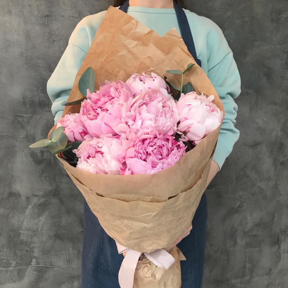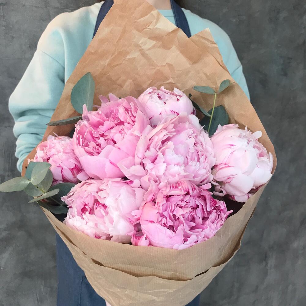 Пион Сара Бернар – 7 шт.Эвкалипт – 1 шт.Упаковка крафт – 1 шт.