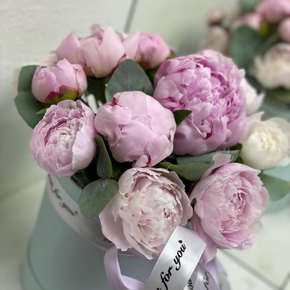 Лента – 2 шт.Зелень – 5 шт.Оазис – 1 шт.Коробка – 1 шт.пионы – 13 шт.
