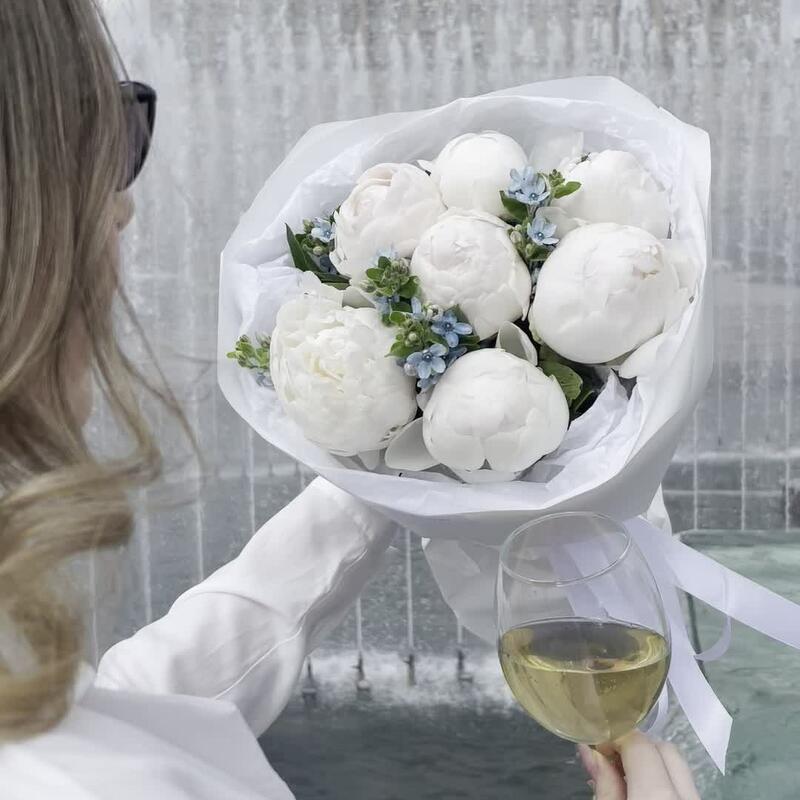Пион белый – 7 шт.оксипеталум голубой – 3 шт.Упаковка дизайнерская – 2 шт.наклейка фирменная – 2 шт.Лента атласная – 1 шт.