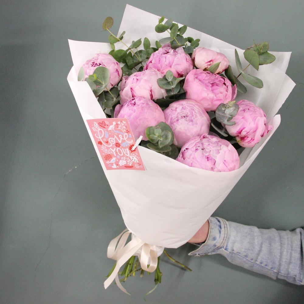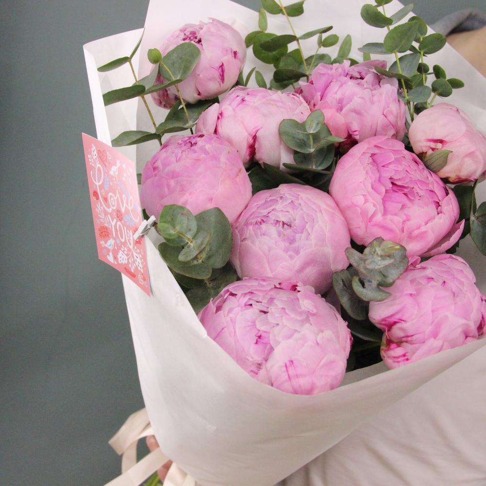Букет из 9 розовых пиона светляку ароматного эвкалипта, в лаконичной упаковке.Стильное цветочное решение для любого случая.