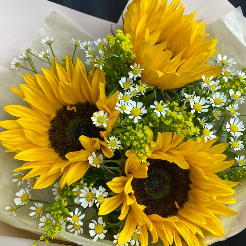 Подсолнух – 3 шт.Матрикария – 3 шт.Солидаго – 1 шт.Матовая упаковка – 1 шт.Тишью – 1 шт.Лента атласная – 1 шт.